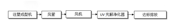 該公司在生產(chǎn)過程中有注塑成型工序,該工序產(chǎn)生了一定量非甲烷總烴有機(jī)廢氣。根據(jù)廠房提供的資料,我們工程師在參考了廣東省地方標(biāo)準(zhǔn)《大氣污染物排放標(biāo)準(zhǔn)》(DB44/27-2001),中華人民共和國《大氣污染物綜合排放標(biāo)準(zhǔn)》(GB16297-1996)后,根據(jù)以往工程經(jīng)驗,為該企業(yè)選擇了UV光解為主體處理工藝。