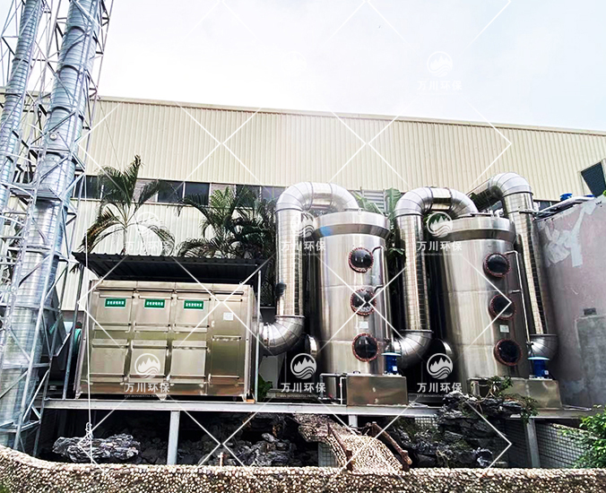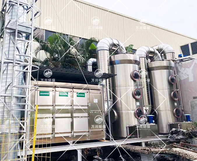 根據(jù)客戶需求和我司實地考察之后,最終采用‘兩級噴淋吸收法+活性炭吸附法’對其進行處理。采用水噴淋一方面可以降溫,另一位方面能夠讓水吸收一部分的有機廢氣,降低后續(xù)活性炭吸附的負荷。